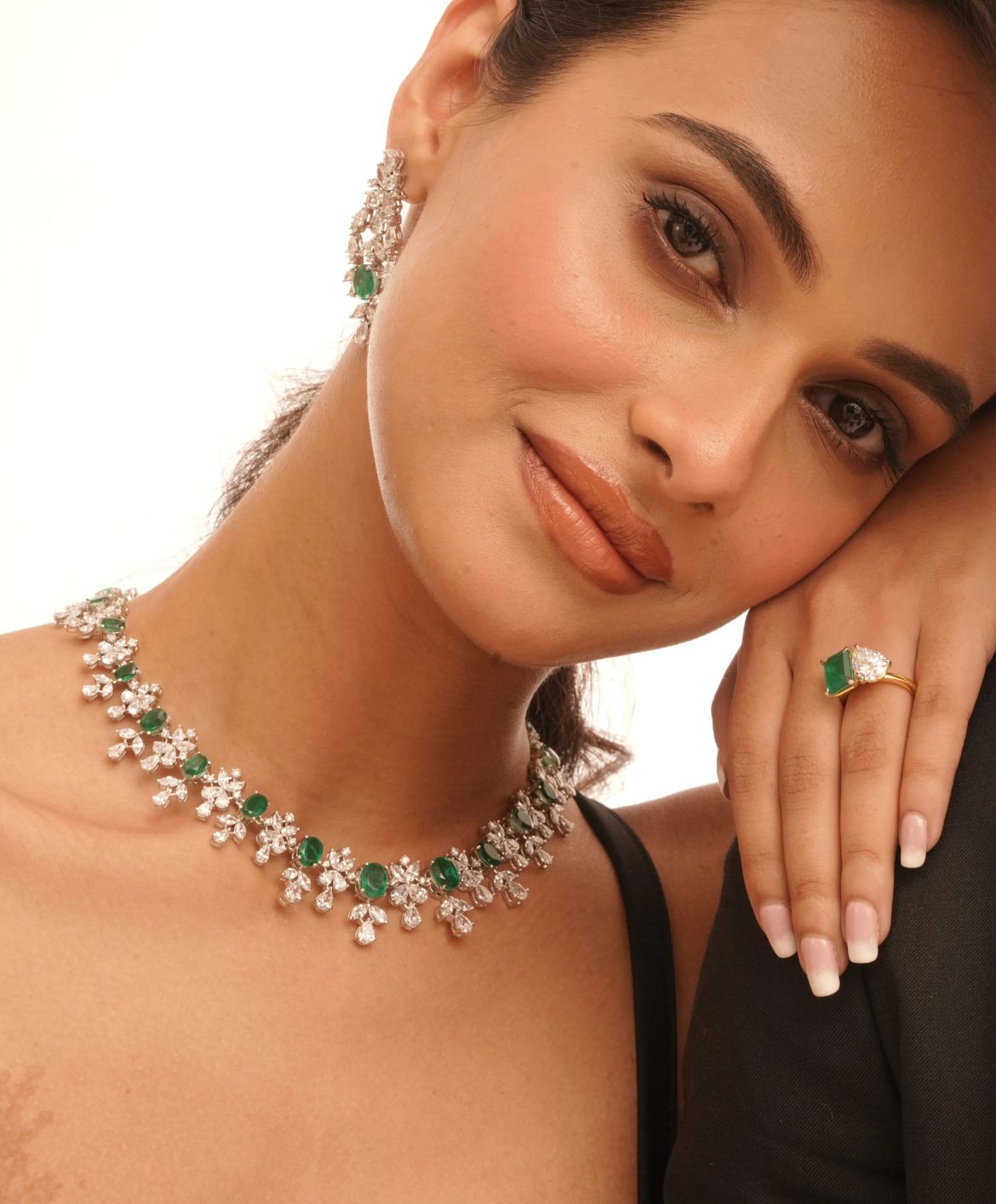 The Enchanté Emerald Necklace Set is pure elegance, designed to mesmerize. Studded with lush oval emeralds and sparkling Swarovski stones, each detail is crafted to capture the light — and every gaze.