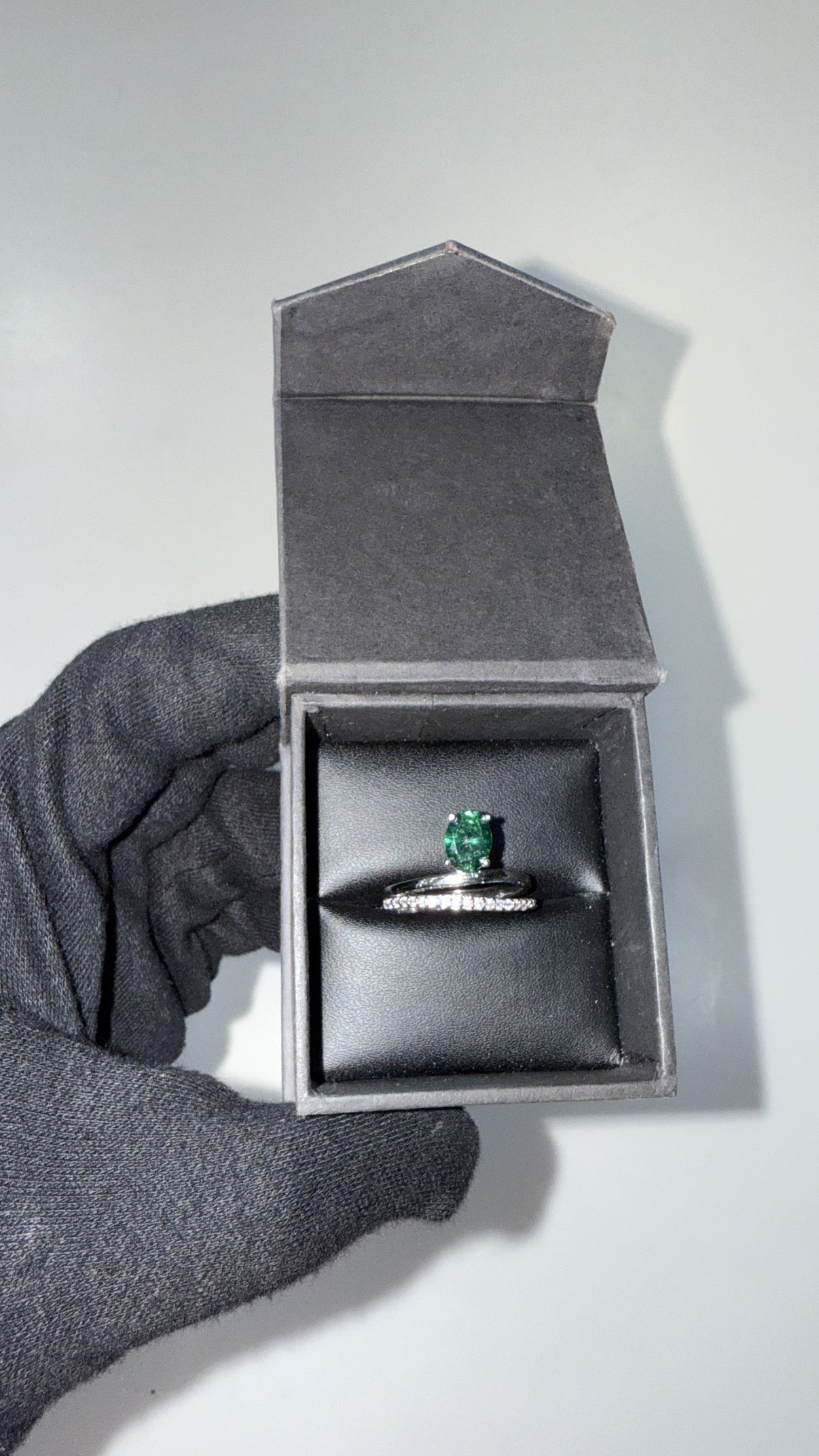 The Luna ring features a stunning oval emerald at its center, glowing with rich, vibrant green tones. Attached seamlessly is a delicate half eternity band, dotted with sparkling stones that add a graceful shimmer. Together, they create a perfectly layered, effortlessly pretty look that’s both elegant and enchanting."