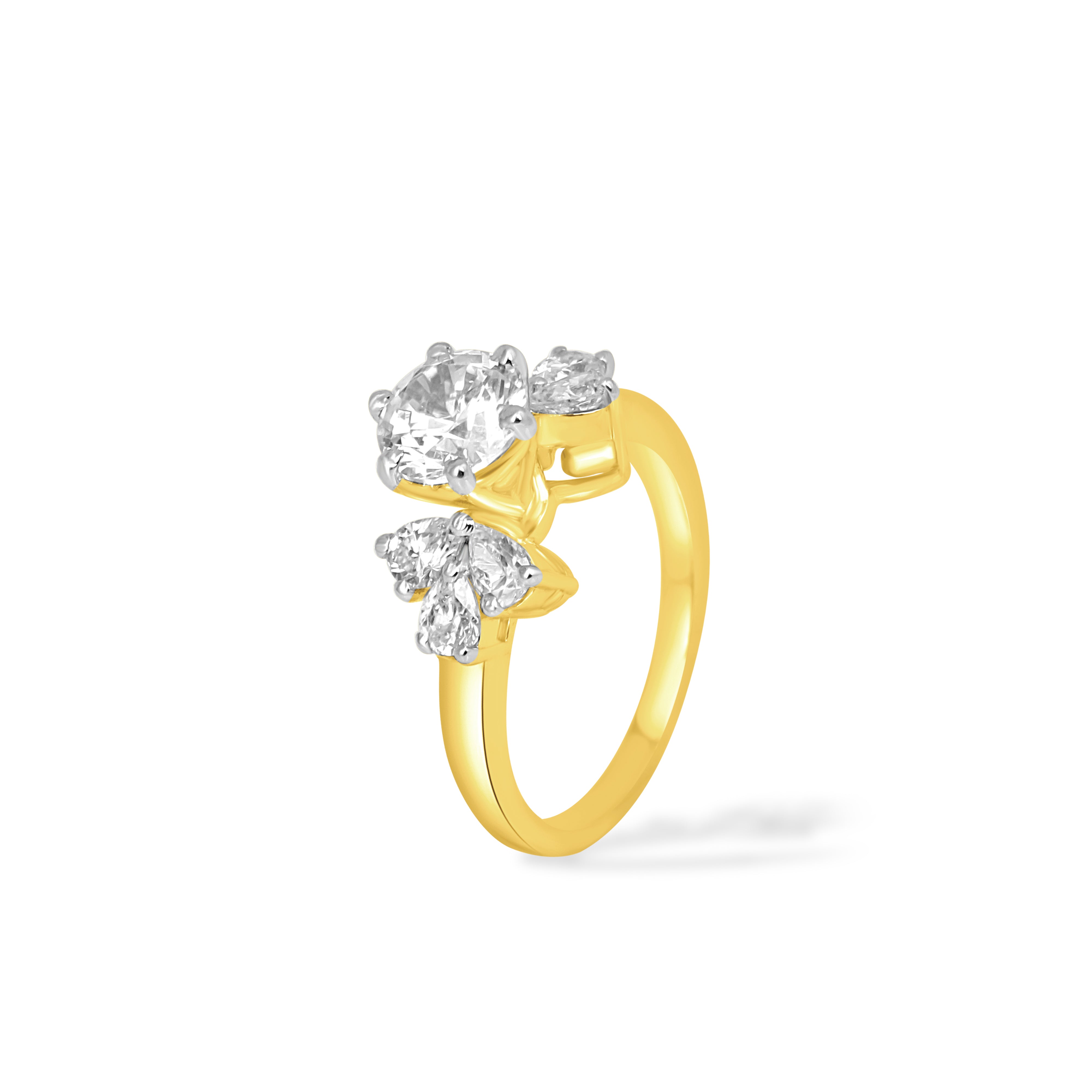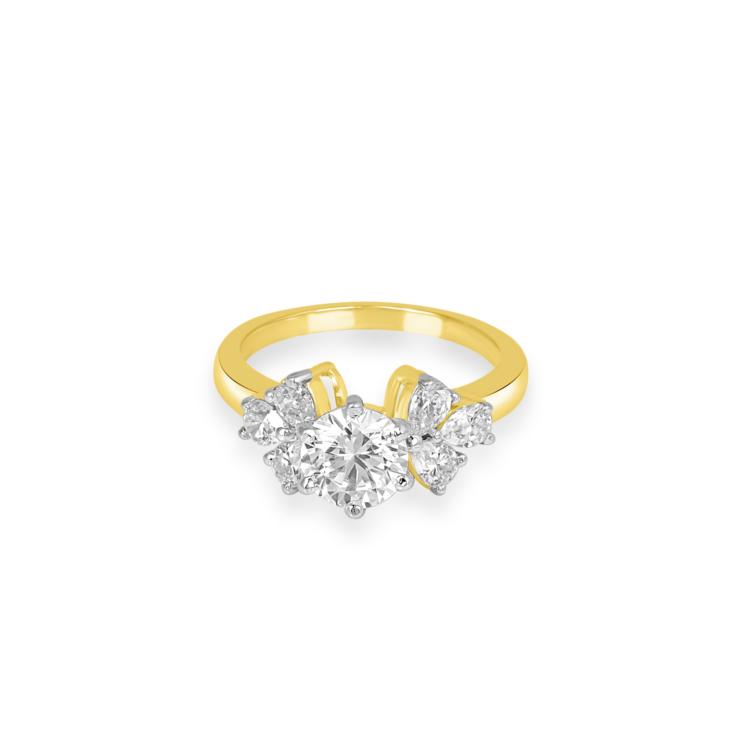 Indulge in pure elegance with The Trilogy Princess Ring. Featuring a stunning combination of round and pear stones, this ring exudes exquisite charm. Make a statement with its timeless design and add a touch of sophistication to any outfit.